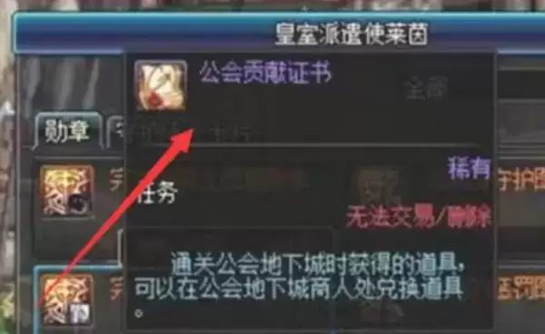 (2)我们也可以去寻找【公会地下城特殊商人皇室派遣使莱茵】使用【工会贡献证书】兑换。