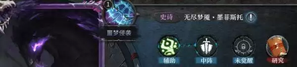 和其它技能不同,无尽梦魇的研究技能:窒息之阵必须消耗墨菲斯托和灵魂之曲才能解锁,效果如下:第一回合开始后,使随机两名敌方英雄各有41%陷入禁锢状态,持续两回合;第二回合开始时,使全体敌方各有41%概率降低基础攻击10%。