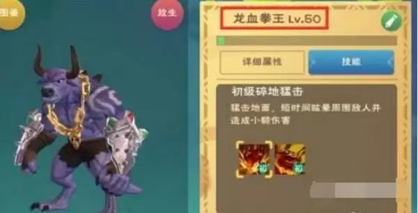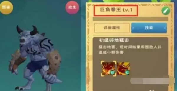 3、我们将巨角拳手升到40级之后去捕捉【大角牛王】,将巨角拳手和大角牛王进行融合获得【巨角拳王】。