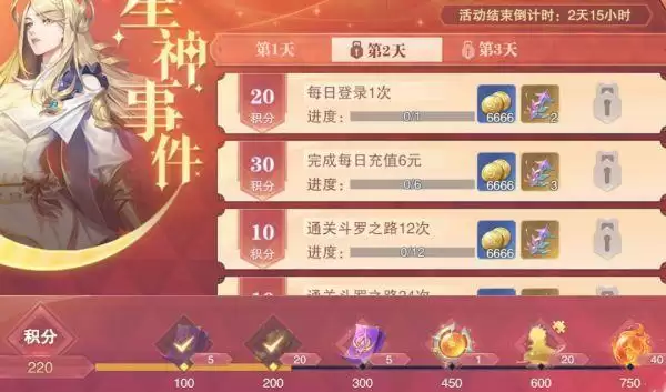 每天完成任务*多可领取42个,3天便是126个考虑到其中部分任务是需要氪金或额外花费体力与钻石才能完成的,对于超级普通玩家而言,3天下来白嫖至少63个还是比较有把握的(因为每日中有个需要开启固定数量秘藏获得奖励的任务,其难度还是不低的)另外对于此活动下方的累积积分奖励而言,想要拿到3天*多的750奖励,至少有1天还是需要大家开启10个秘藏才能保底获得,大家注意即可
