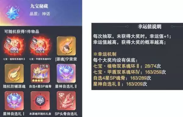 首先本次活动的两个关键之一便是用“九宝秘藏”可以去抽取的宁荣荣第2和第4技能双系魂环,这个我们待会再细说,反正这两个玩意一个是75次保底,一个是260次保底,其中第4技能这个260保底着实也是有些夸张......