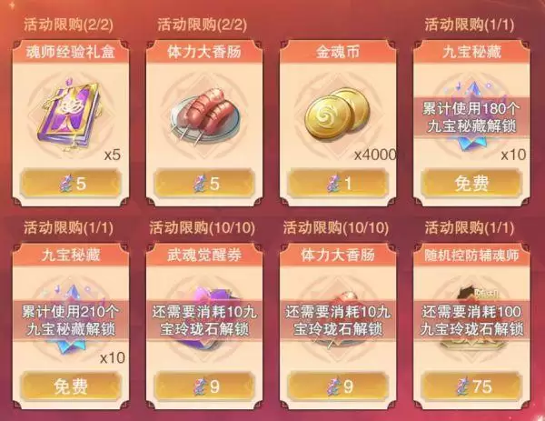 体力大香肠这玩意,如果用对应钻石的购买成本去计算性价比还行,缺体力的朋友可以酌情考虑武魂觉醒券还是硬通货,平时多囤一点总是没有错的双系魂环大家酌情兑换即可,因为其兑换的门槛也不算低(至少需要消耗175个九宝玲珑石)星神系列资源,这个就根据大家的实际情况自行斟酌了,对于缺高星级魂骨的朋友这个资源也还是比较有意义的接着的百炼钢,虽然价值很高,但兑换门槛这次也很高......所以大佬玩家可以试试最后的金魂币目前也是相当相当的稀缺,急迫需要这项资源的朋友也可以考虑一下,1个玲珑石换40000个金币,还行吧......
