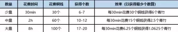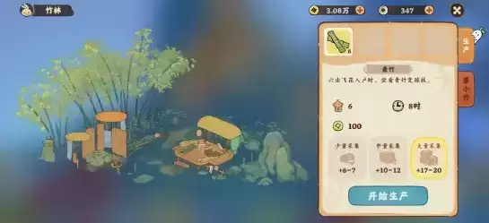 2、少量采集花费的铜钱最少,只需要30分钟,获取青竹数量为6-7个;