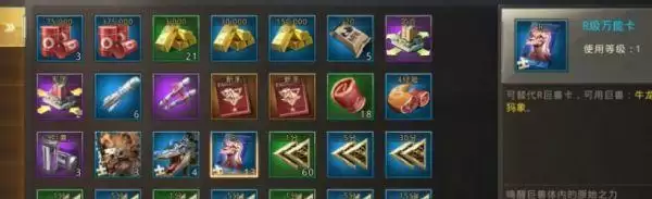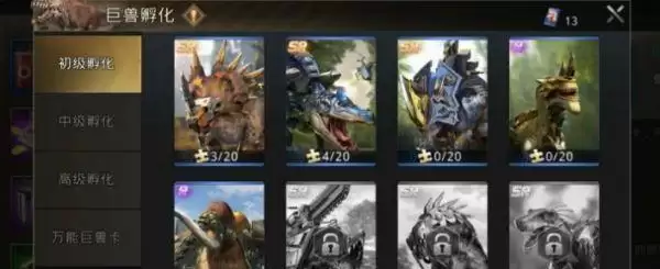 在巨兽孵化的界面中,可以看到在上面的位置都是通过同一种恐龙的碎片进行合成的,合成的条件还是说比较困难的,这时候我们点击到*下面的位置,就能够看到万能巨兽卡的界面了,我们在这个位置,是可以使用我的R级万能卡的,但是其实除了R级还有SR和SSR级别的万能卡。