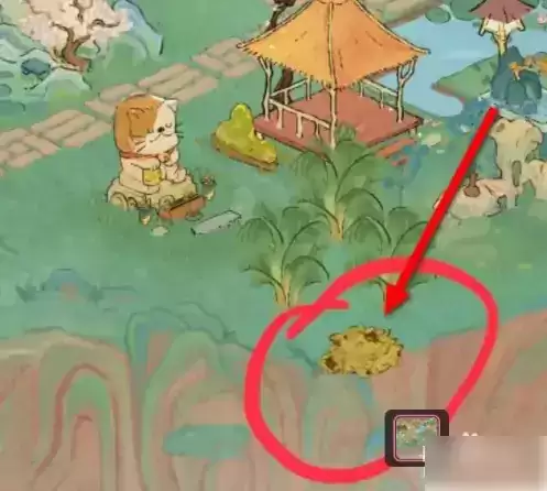 然后,来到东南方向的草丛中即可找到草帽,如下图位置所示。