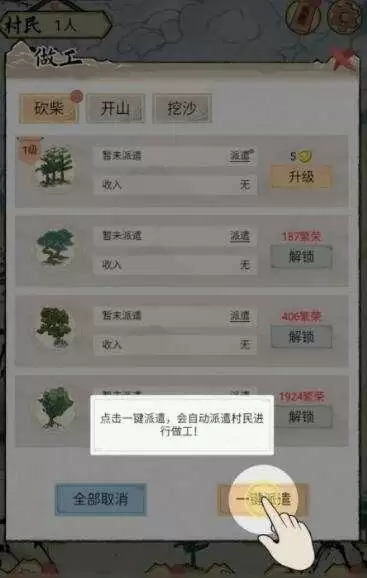 4、点击“一键派遣”按钮后,派遣村民做工获得收入即可。