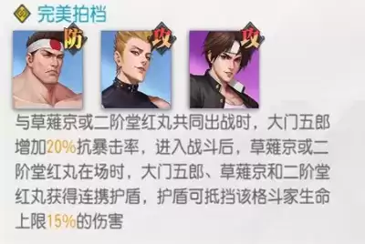至于最后,二阶堂红丸主要是易于获取并且可以激活不少羁绊,而草薙京作为前期对灼烧队的大核自然无需多说。在其他队友的增益辅助下,他的输出能力*是是不容小觑的。
