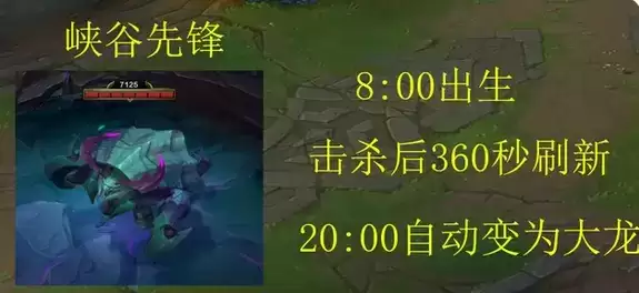 8、峡谷先锋:8分钟后出生,击杀后360秒刷新,20分钟后变成大龙。