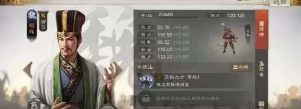 荀彧的自带战法叫做“王佐之才”,品质为S级,是个很强力的辅助技能。在释放之后可以提升友军所有的属性,高达五十六点。如果他的智力越高,所提升的数值也会变得更高。另外还可提升移动速度。至于传承技能则可佩戴匡弼天下,能够让他变成一个大奶,为队伍快速地恢复血量。所以大家在培养这个角色的时候,不用投入过多的成本,无脑地升级这两个战法即可,并且智力地提升成本也不高。