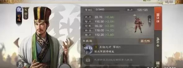*战法为:启动型战法王佐之才,能够让友军全属性高数值提升,同时还会受到智力的额外影响,智力越高提升的数值就越加的恐怖,还能够附加上移动力提升的效果,只要获取效果加成,在武将死亡和更换目标之后才会取消该状态,可以说是一个永久性的BUFF加成了,这个加成效果是该武将独有的,可以看得出其价值有多高了。