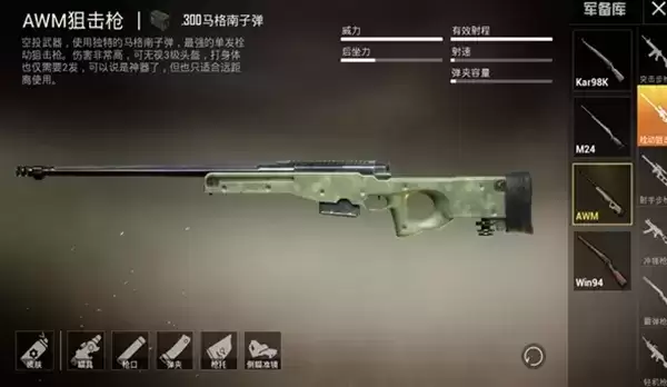 AWM是游戏中最强的狙击枪,目前只能在空投中获取。