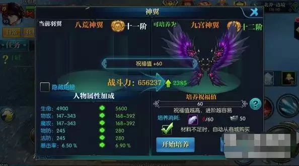 翅膀升阶需要消耗材料神羽,商城就有卖哦,并且价格相当便宜,只需要20银元宝就可以购买一个,购买了材料就可以进行进阶操作了,可以选择手动培养,也可以选择自动培养,要是材料不足,可以勾选自动购买选项。