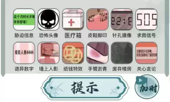 胁迫信息,恐怖头像,医疗箱,皮鞋脚印,针孔摄像,求救信号,诡异数字,墙上人影,纸钱*,手臂淤青,关心言论