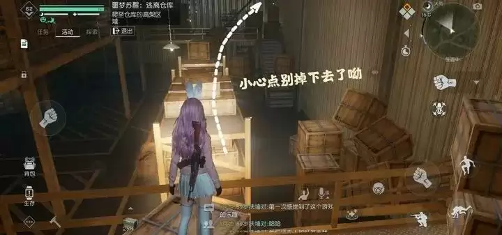 第三步:跳到架子顶部,顺着横杆走过去,右转从架子顶部走过去,注意别掉下去了哦