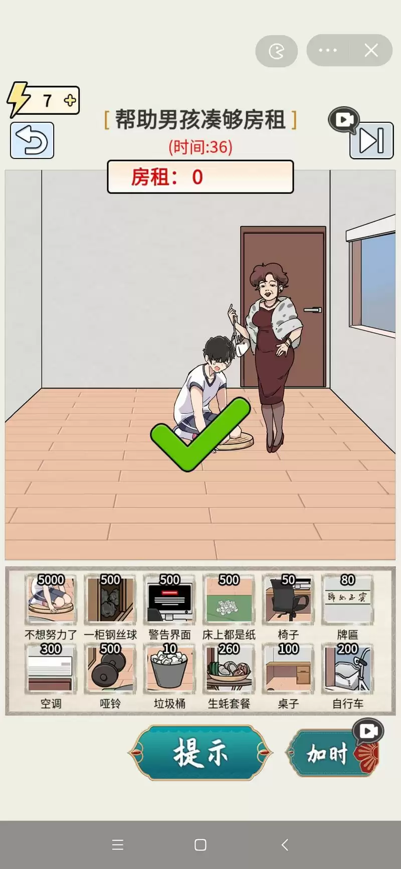 1、这关想要凑够8000房租需要找到下列物品:不想努力了、一柜钢丝球、警告界面、床上都是纸、椅子、牌匾、空调、哑铃、生蚝套餐、垃圾桶、桌子、自行车
