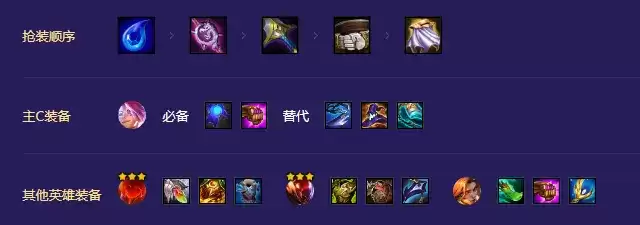 伊泽瑞尔必备蓝霸符和珠光护手,第三件装备优先选择巨人捕手或者班克斯的魔法帽,如果有珠光莲花的前提下也可以不需要珠光护手; 主坦李青必备狂徒铠甲,想要追求高抗性装备就合成棘刺背心和巨龙之爪,想要追求免伤也可以合成救赎和石像鬼板甲; 多余的输出装备可以给予厄运小姐或者费德提克。