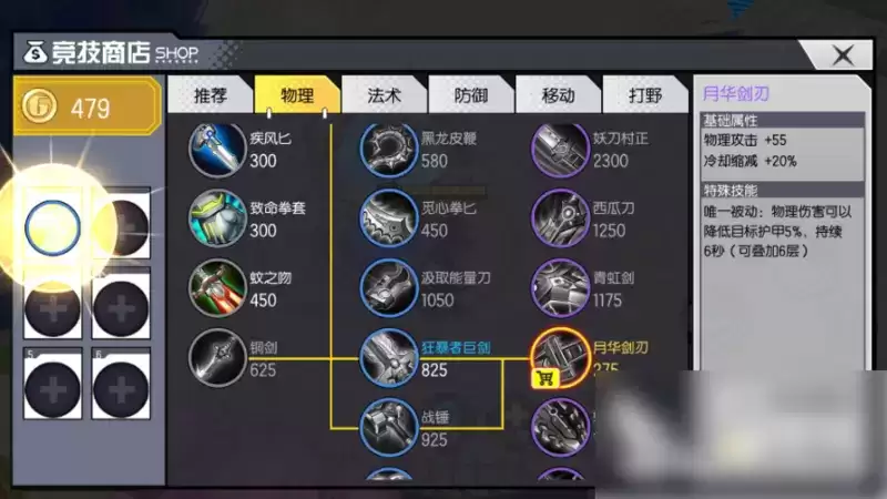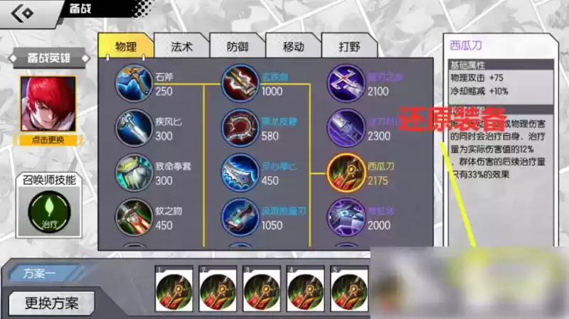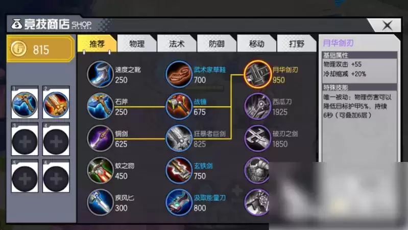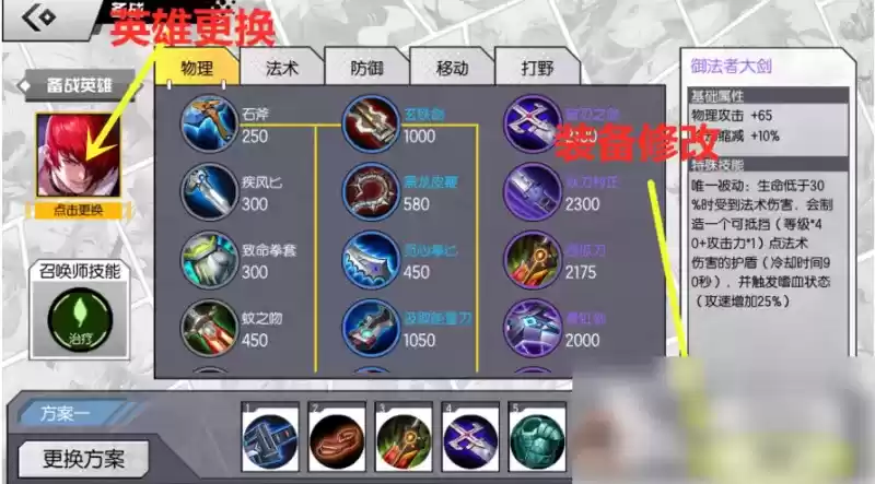 玩家点击进入备战面板,在这面板中会出现当前版本中最新发布的英雄的推荐出装界面,这是系统自定的,所以需要玩家们自己进行更改。由于每个英雄的属性都不一样,所以玩家需要在物理、法术、防御、移动、打野五个内容面板中选择适合的装备。
