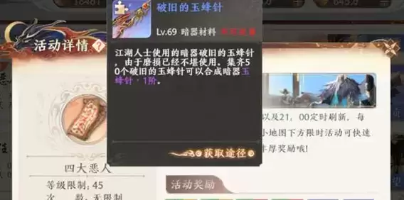 如果你的运气够好,那么也是有机会在击杀它们之后直接获得一个完整玉峰针的,这个暗器对于玩家的提升很大,直接获得一个完整的也会省去不少功夫。当然,该活动的开启时间和刷新的恶人数量是有限的,所以建议大家尽量在活动刚开始的时候就前往参加。