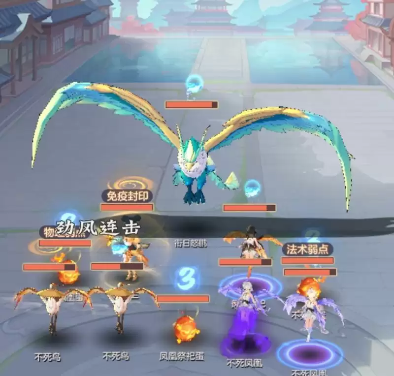 首回合开始,优先打掉战意酒与天机酒,封印BOSS下面的那只金色翅膀的凤凰(这只凤凰会封印人)