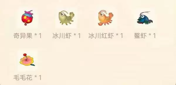 1、食谱配方:奇异果*1、冰川虾*1、冰川红虾*1、鳌虾*1、毛毛花*1
