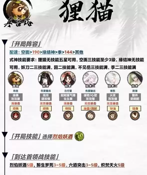 2.式神技能要求:狸猫无技能五星可用,空面三技能至少3级,緣结神无技能可用,妖刀二三技能满,因二技能满,不见岳三技能满,季二三技能满。