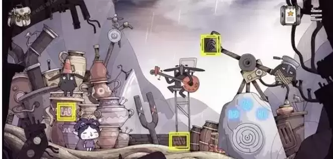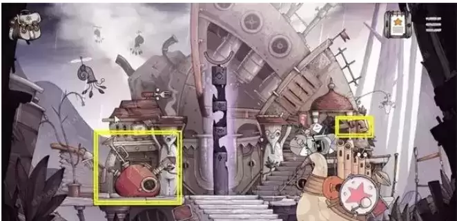 2.切换角色为机器人,推开瓦砾,把3样物品分别插入红色装置(螺丝第一、喇叭第二、烟囱第四)。然后点击蜗牛上方的管道。