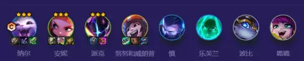 2费强化拿【安妮】-【嗜火】,3费强化拿纳尔【同步镀层】,5费强化拿【努努和威朗普】-【当面推球】