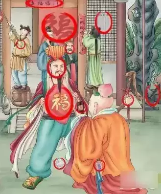 3、前面的人是福星,他对面的人在扫福,身上有护身福,角落里有一个斧头