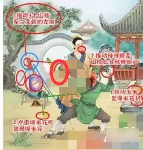 1、首先地上有土豆,石桌上有玉米、辣条,关羽手里拿着黄瓜和棒棒糖