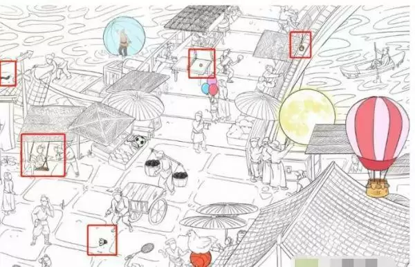 2、左上角河里有泥鳅,旁边的人推着水上行走球,往右可以看到小小的乒乓球,下面的人拿着气球