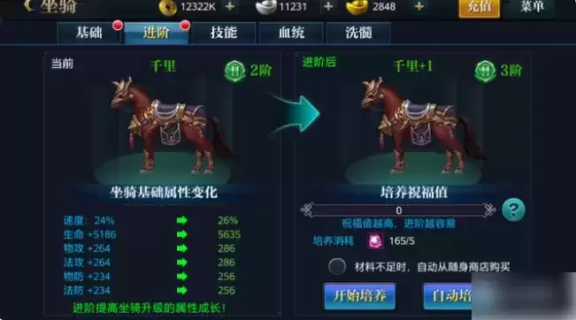 将军们想要曾强战力,坐骑进阶是一个非常直接的选择。坐骑进阶需要消耗坐骑丹,坐骑丹可以商城直接购买,坐骑副本也能获得,坐骑进阶之后会跑得更快,给予将军更强大的属性。