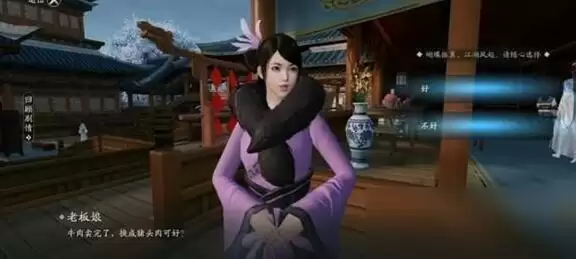 给小宝送些他爱吃的器械,望江楼中和老板娘对话,老板娘说牛肉已经卖完了,只有猪头肉了。