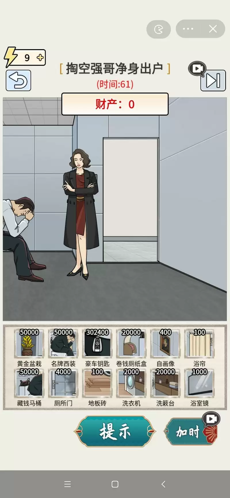1、本关要找的12个值钱的东西分别是:黄金盆栽、名牌西装、豪车钥匙、卷钱厕纸盒、白画像、浴帘、藏钱马桶、厕所门、地板砖、洗衣机、洗漱台、浴室镜