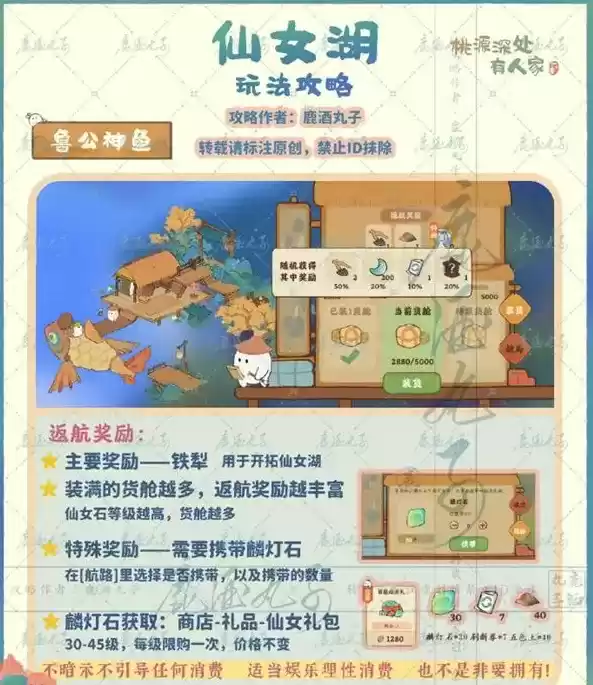 (2)仙女石3級:解锁仙女湖钓鱼点、奇货价值提高、:鲁公神鱼货舱数增加3层。