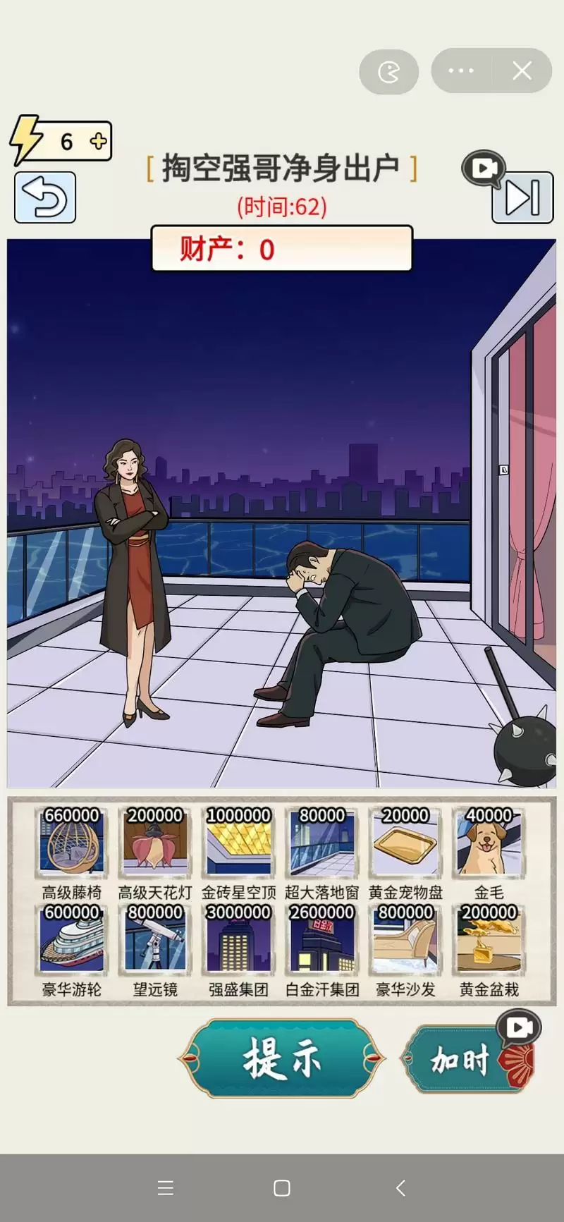 1、本关想要掏空强哥净身出户需要找到下列物品:高级藤椅、高级天花灯、金砖星空顶、超大落地窗、黄金宠物盘、金毛、豪华游轮、望远镜、强盛集团、白金汗集团、豪华沙发、黄金盆栽