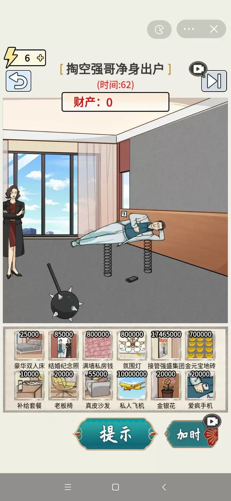 1、本关需要找到下列物品才能让强哥净身出户:豪华双人床、结婚纪念照、满墙私房钱、氛围灯、接管强盛集团、金元宝地砖、补给套餐、老板椅、真皮沙发、私人飞机、金银花、爱疯手机