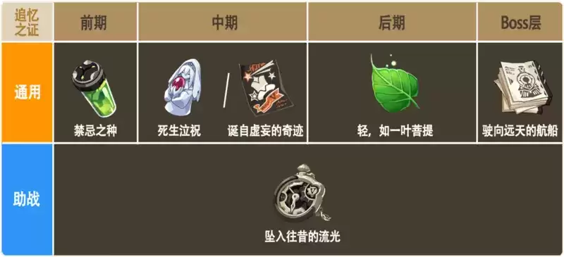 ②助战证:前面小怪层带坠入往昔的流光来提高双倍层的成功率;最后boos层可以不换,如果换的话就选沉金如梦。