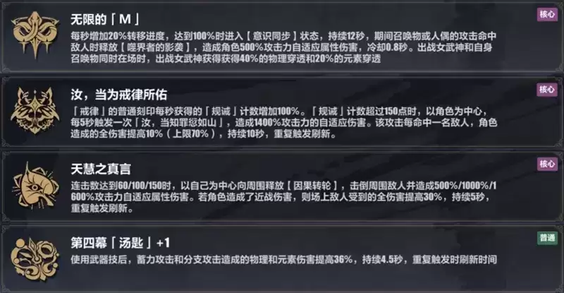 通用刻印方面前期主选无限二,解锁核心后补上戒律二、天慧一和螺旋一,三者中除了戒律要拿到增幅穿透刻印外,其余的只解锁核心刻印就行。