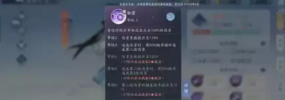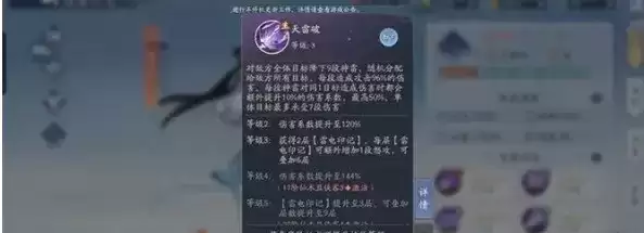 天雷破:对敌方全体目标降下9段神雷,随机分配给敌方所有目标,每段造成攻击96%的你害,每段神雷对同1目标造成伤害时都会额外提升10%的伤害系数,*高50%,单体目标*多承受7段伤害