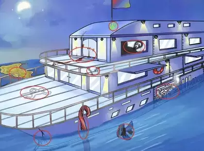 1、首先移动放大镜到甲板上,找到人的痕迹,然后移动到旗帜下方,找到绿手印,移动到右边窗户找到诡异影子;