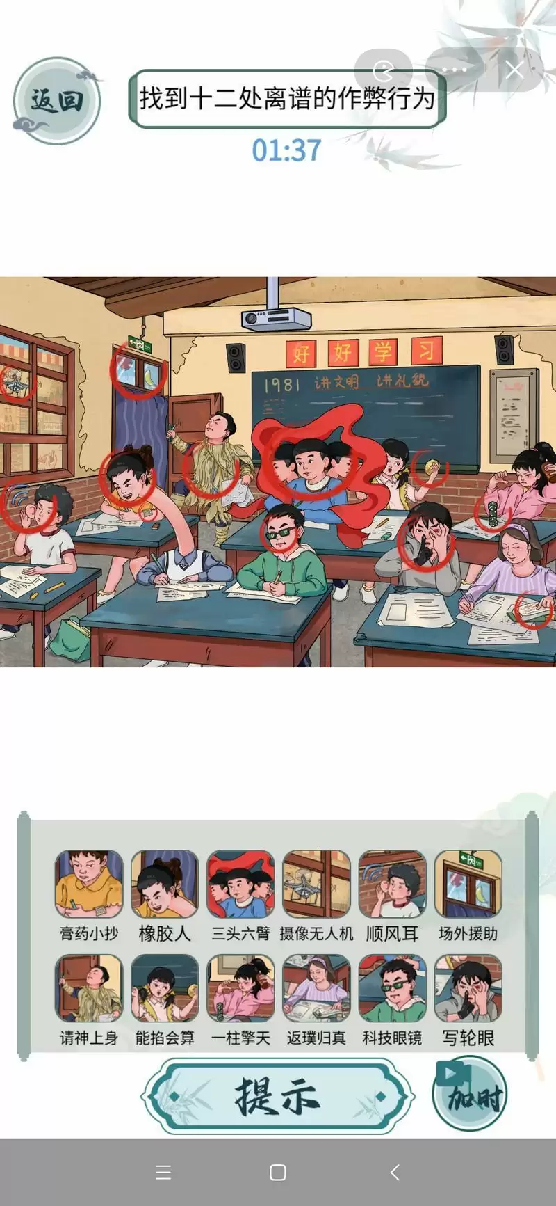 1、本关要我们找出的十二处离谱作弊行为是:膏药小抄、橡胶人、三头六臂、摄像无人机、顺风耳、场外援助、请神上身、能掐会算、一柱擎天、返璞归真、科技眼镜、写轮眼