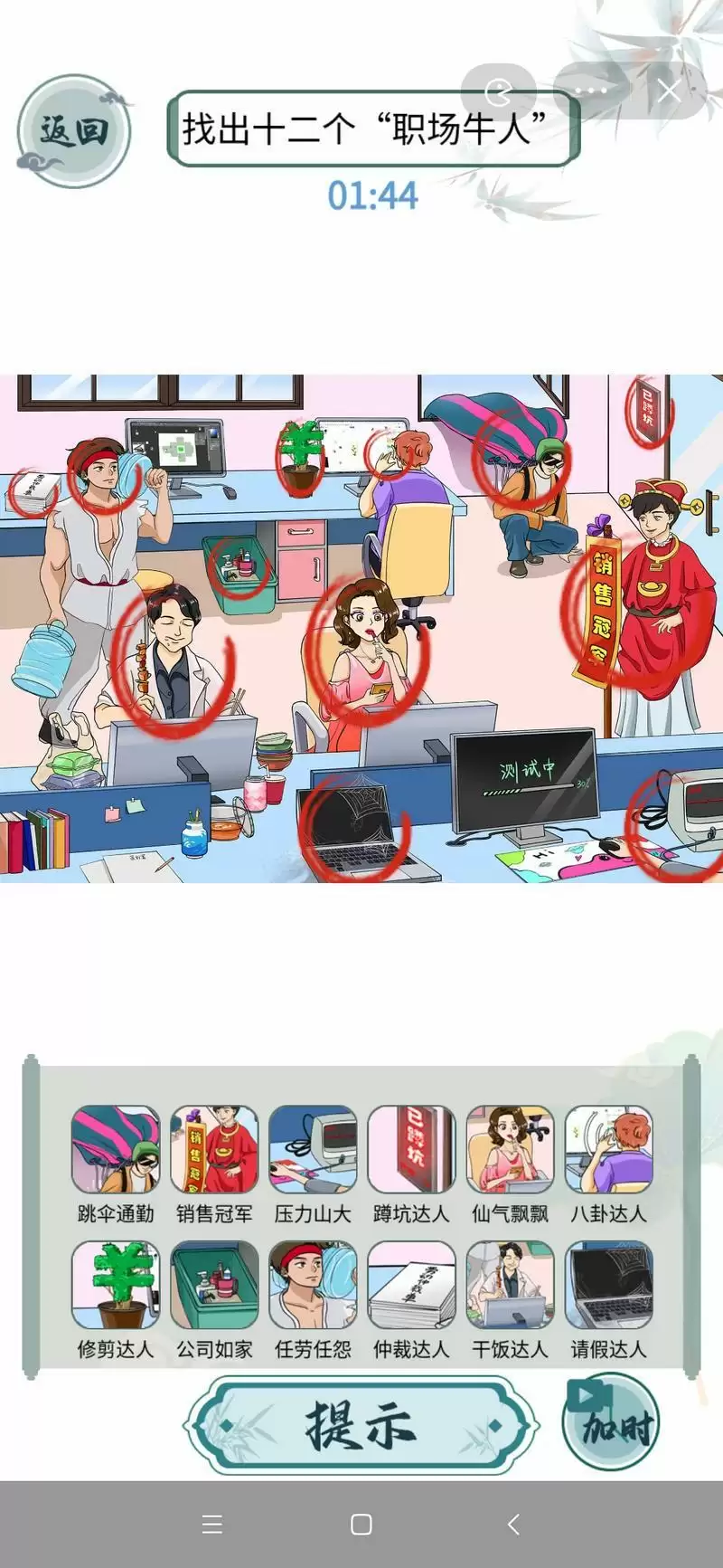 1、本关的十二个职场牛人如下:跳伞通勤、销售冠军、压力山大、蹲坑达人、仙气飘飘、八卦达人、修剪达人、公司如家、任劳任怨、仲裁达人、干饭达人、请假达人