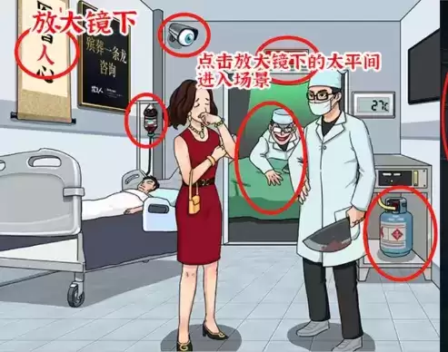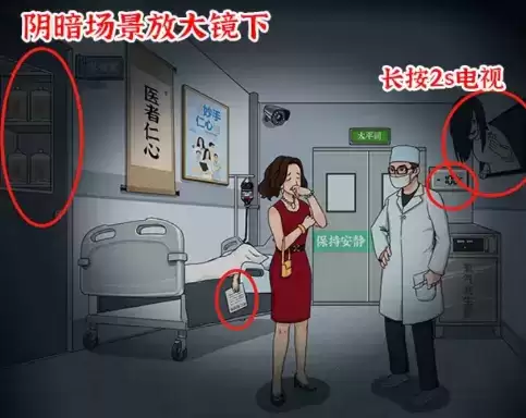 1、本关需要用到场景切换,切换方法是把放大镜拖到亮灯的【手术中】灯牌上,点击后进入阴暗场景,两个场景各自要找的地方不同