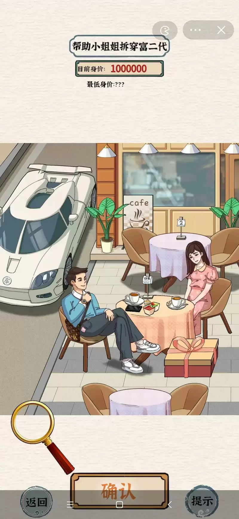 2、放大镜拖动至人身上,找到画的手表,破洞袜子,口袋里的报纸山寨包,和系在腰上的绳子