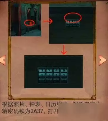 3、根据照片,钟表,日历线索,得知床底木箱密码为2637。