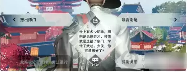 与转职NPC对话,选择【叛出师门】后,回到师门完成【杯酒断义】任务,完成后即将遭到门派追杀,被追杀后可与转职NPC兑换是否选择【不悔】(继续任务,逃离追杀后即可脱离师门完成),也可以选择【忏悔】(转职失败,停止被追杀)。第一种选择大家还是要量力而行,以免浪费时间。