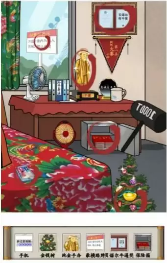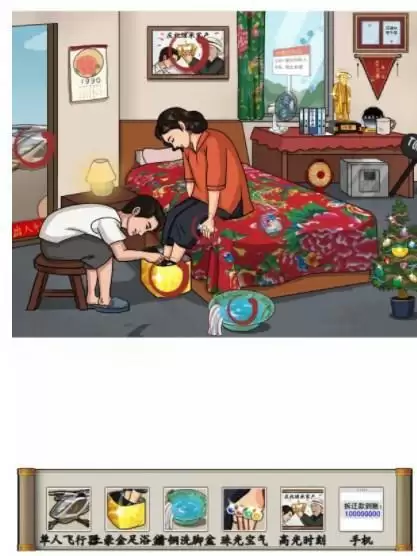 门外的单人飞行器;洗脸盆,土豪足浴盆;旁边的盆,青铜洗脸盆;女子手上的一排宝石戒子,珠光宝气;墙上的画,高光时刻;点击手机,拆迁款到账,手机;窗外6A景区告示牌,豪横路牌;桌子上的干爹像,纯金手办;墙上的证书,贝诺尔吹牛奖,贝诺尔牛逼奖桌子下保险箱,输入1990,保险箱;床边上金钱树;拖动1000T锤子到金钱树左侧,敲击,出现金砖地板。