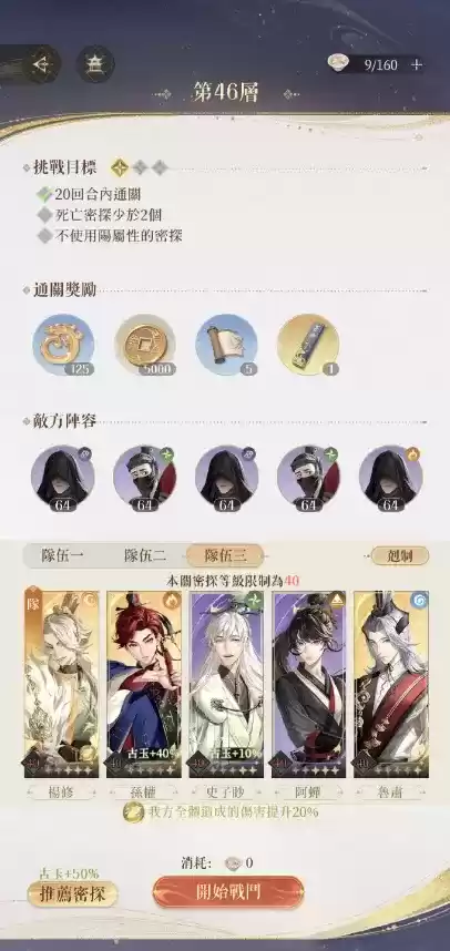 3、在第一二层尽量拖到15-20回合(随着回合数的增加敌人的攻击力会下降)这样进入第三层的时候孙权挨打不痛不痒!并且有足够的时间让狮子喵给大家的血量恢复到几乎满血,也能够全员带着大进入第三层上来就猛猛开大。第三层优先攻击那三个戴兜帽的。