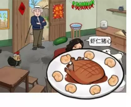 4.虾仁猪心:拖动桌子上的虾仁和灶台上的猪心到大锅;