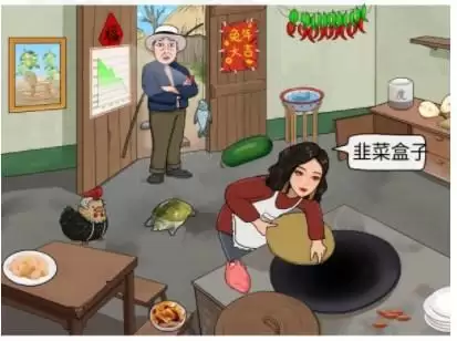 9.韭菜盒子:拖动地上的盒子到大锅,点击泰叔手机的手机,投影到门上下跌曲线,拖动曲线到大锅;